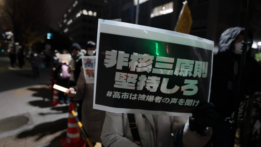 12月23日,在日本东京的首相官邸前,民众参加抗议集会。\n 新华社发