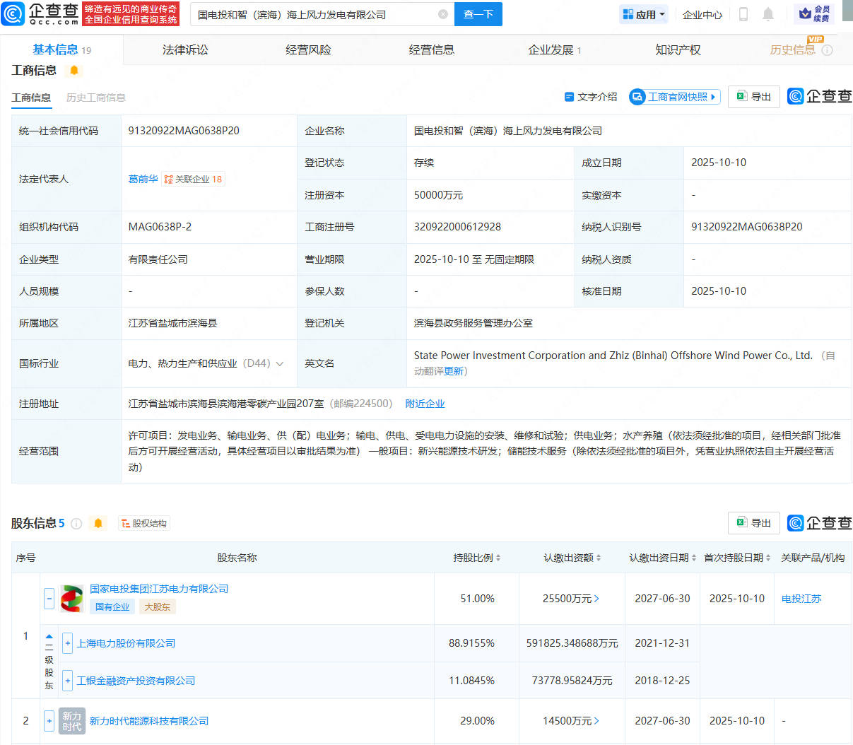 近日,国电投和智(滨海)海上风力发电有限公司成立,法定代表人为葛前华,注册资本为5亿元,经营范围包含:发电业务、输电业务、供(配)电业务;供电业务;水产养殖;新兴能源技术研发;储能技术服务等。企查查股权穿透显示,该公司由上海电力(600021)旗下国家电投集团江苏电力有限公司、新力时代能源科技有限公司等共同持股。