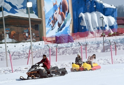 东南亚游客在西岭雪山景区游玩雪上项目。